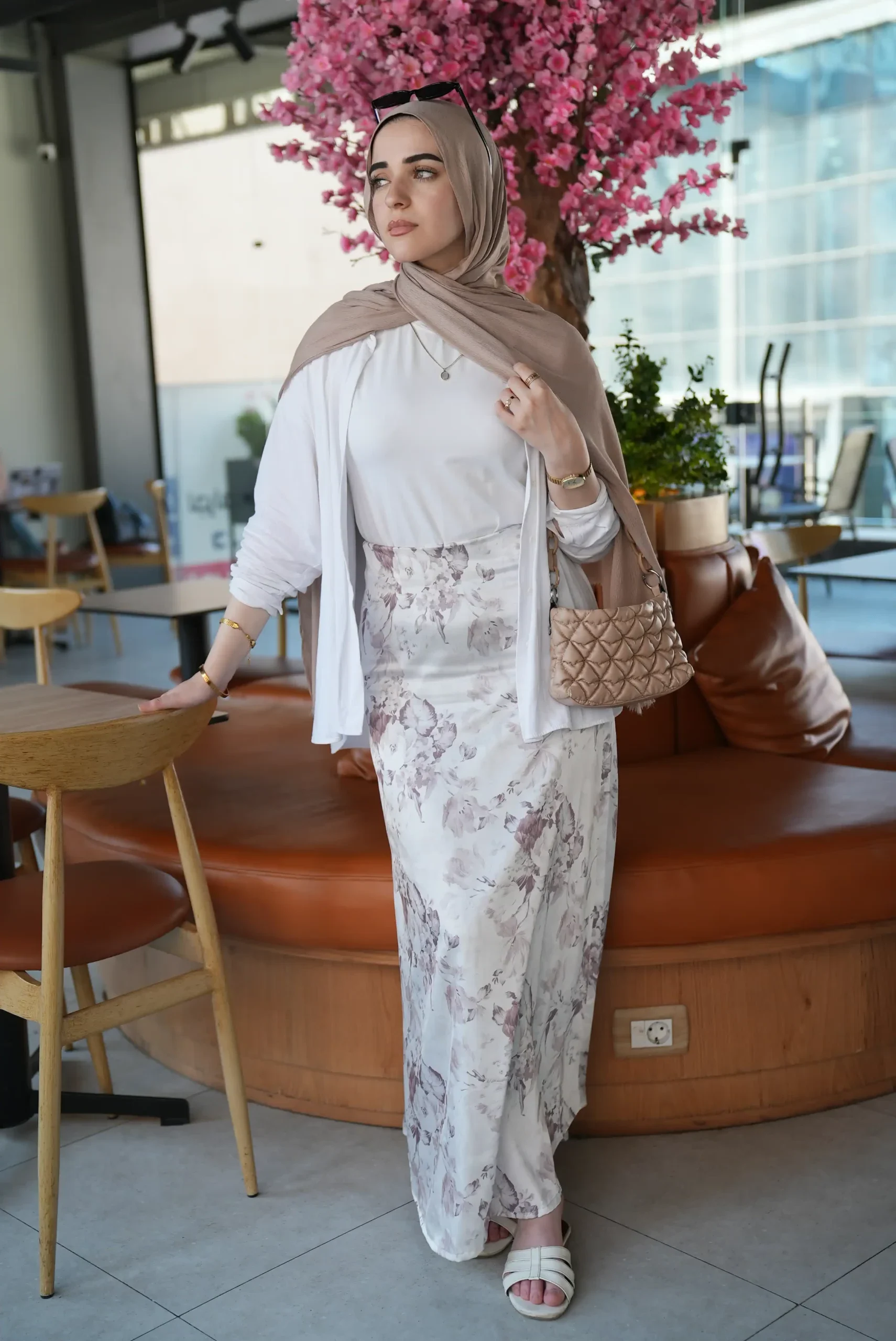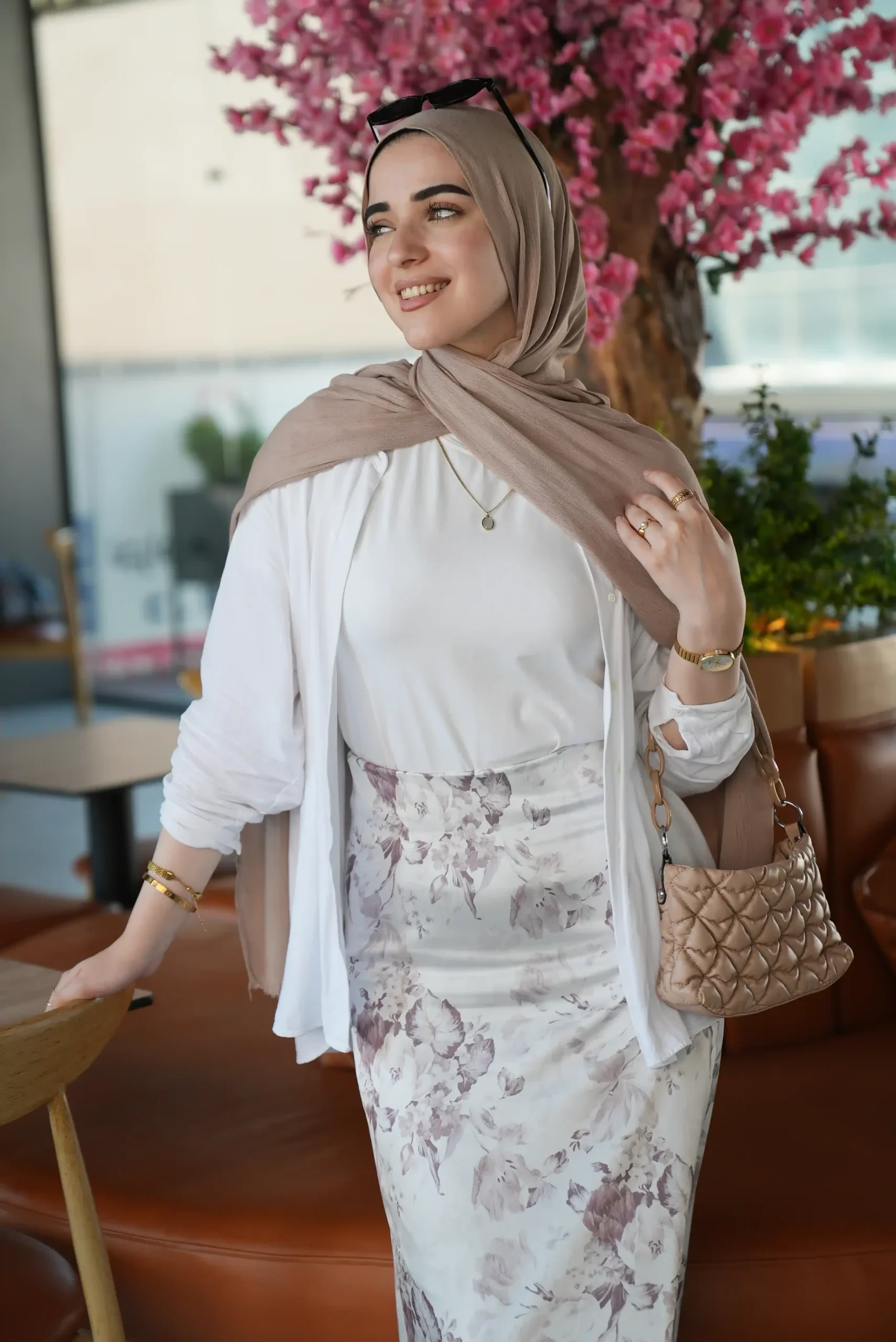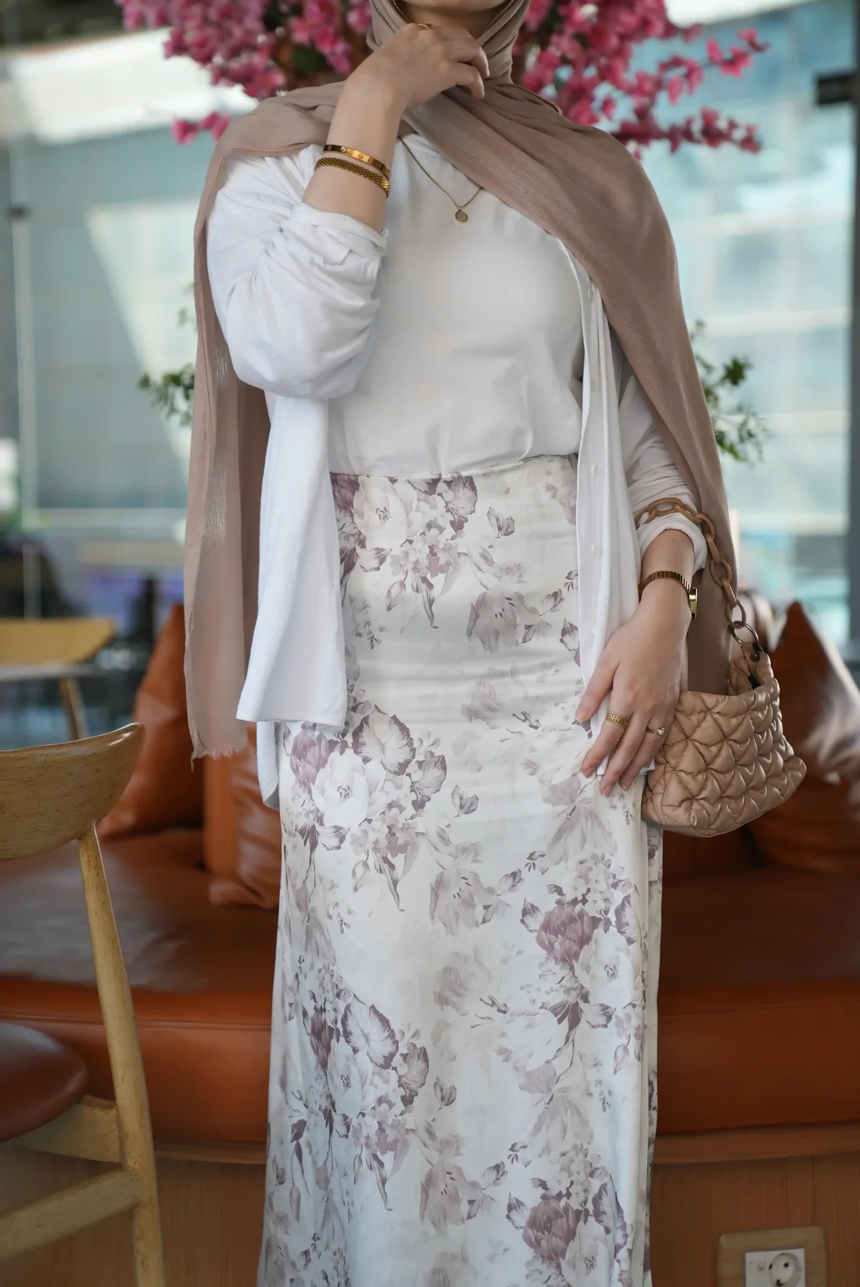 The Velora Skirt, crafted from luxurious satin, is designed to embrace your femininity with a soft floral touch and a graceful silhouette